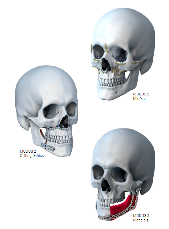 MODUS2 is een verdere ontwikkeling Modus1 en onderscheidt zich door het brede assortiment van innovatieve plaat- en schroefontwerpen voor de onderkaak, , midface en de orthognathie. Innovaties zijn onder meer de voorgevormde platen met verbeterde anatomische pasvorm en een een laag plaatprofiel. Dit faciliteert het makkelijk buigen van de platen en verbetert tegelijkertijd de stabiliteit van de schroef. Het inbrengen wordt verbeterd door corticale schroeven met een geoptimaliseerde schroefdraad bij de schroefkop en een toelopende schacht voor de schroefjes. Alle MODUS 2-implantaten en -instrumenten zijn ontworpen om het de kaakchirurg gemakkelijker te maken.