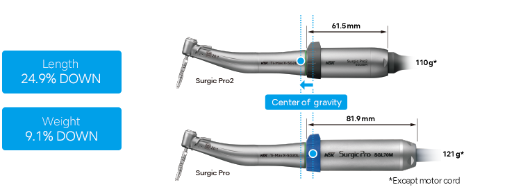 De nieuwe motor van de Surgic Pro2 is nog compacter (25% korter) en 9% lichter dan de voorgaande SurgicPro1 motor.