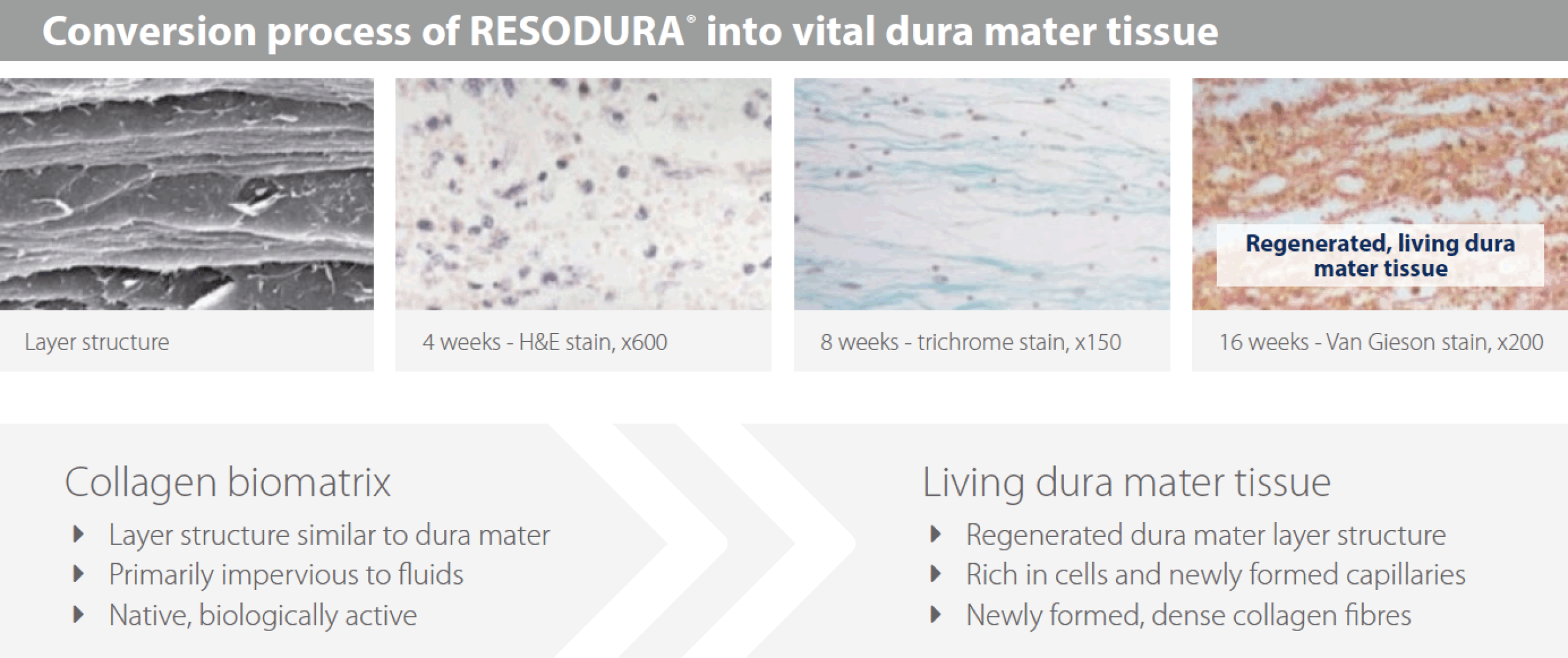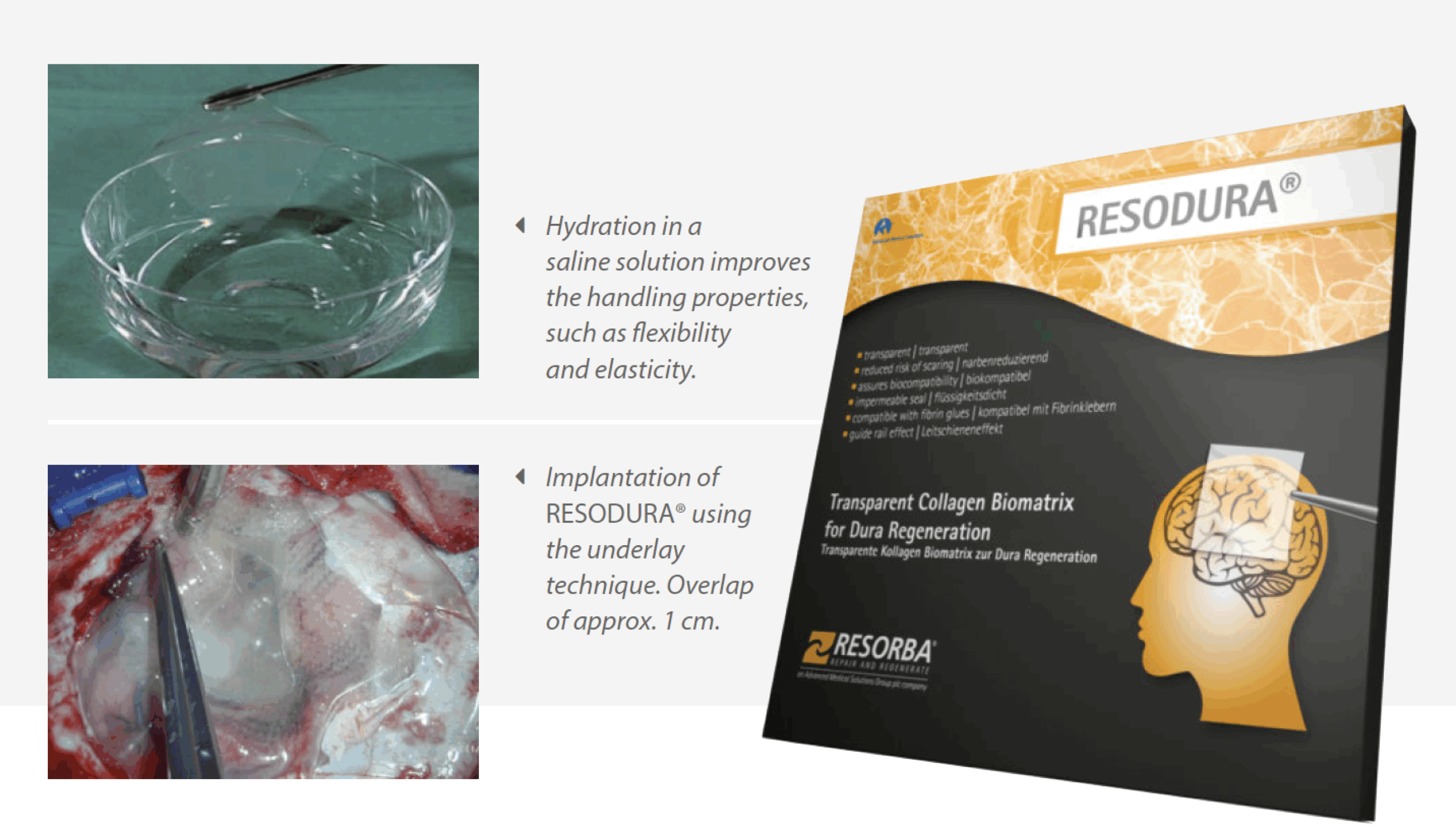 RESODURA is een biologische, resorbeerbare dura-vervanger geïndiceerd voor gebruik in neurochirurgie die specifiek transparant is voor een optimale visuele inspectie van het onderliggende weefsel.