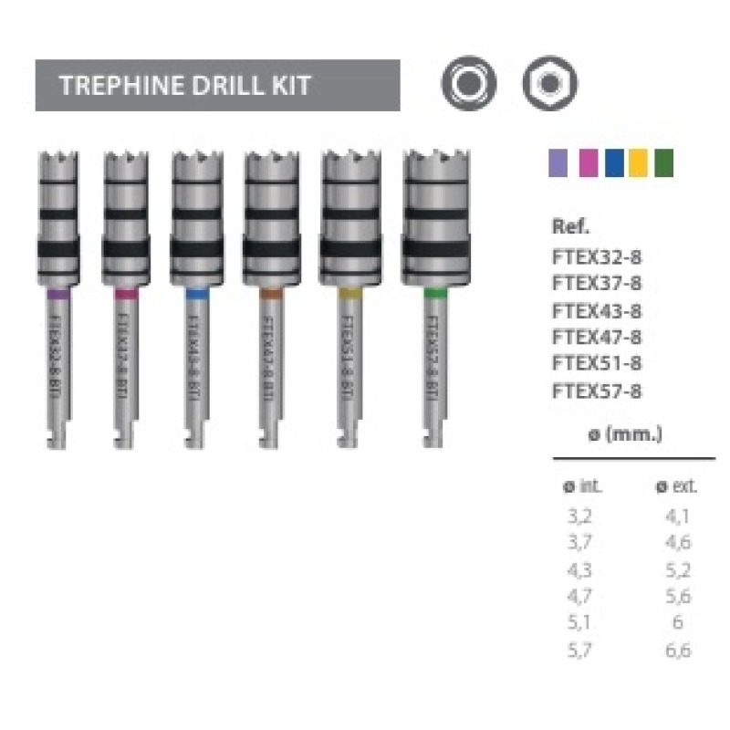 Deze optionele borenset met 6 verschillende diameter trepaanboren is beschikbaar om de eerste cortex deels vrij te leggen. Hierna kan het implantaat alsnog verwijderd worden met de BTI torque wrench (LLT200) en de benodigde extractor.